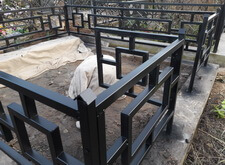 Возвращаемся на могилу. Подготавливаем оградку к покраске, зачищая её от старого покрытия. Параллельно устанавливаем подставку для памятника.